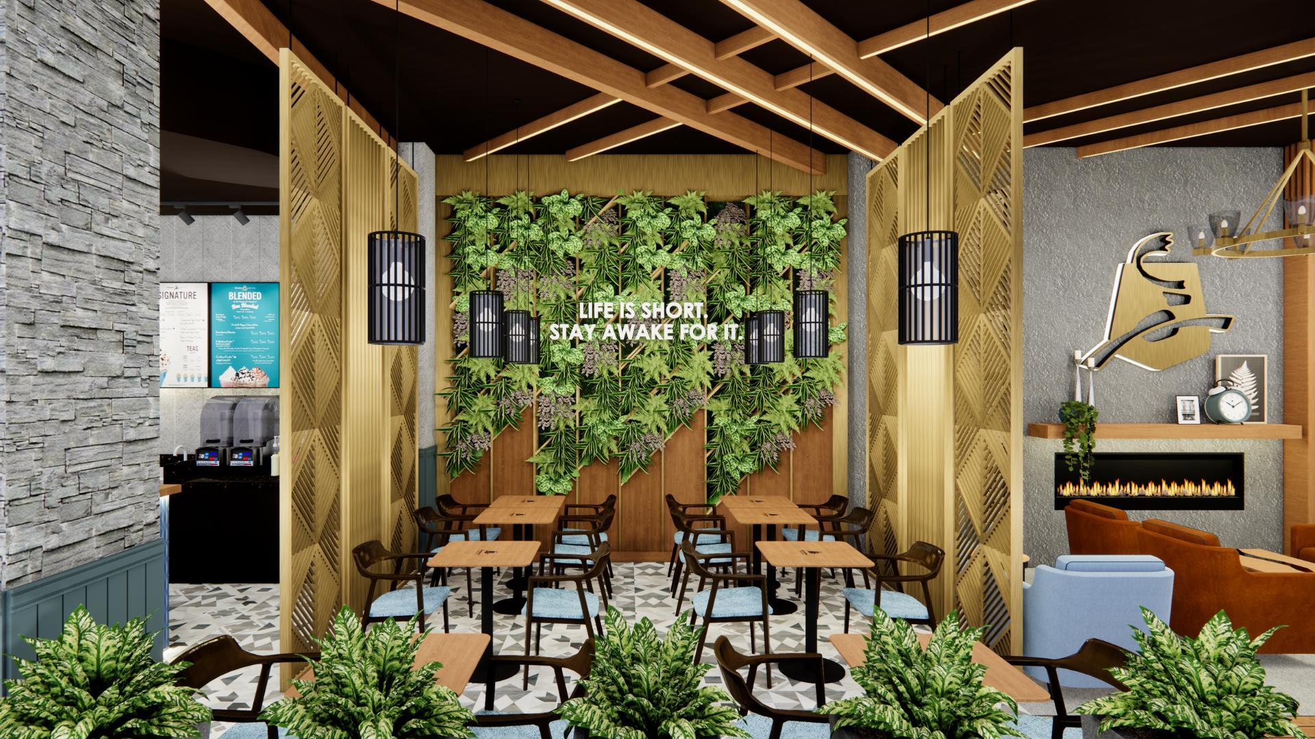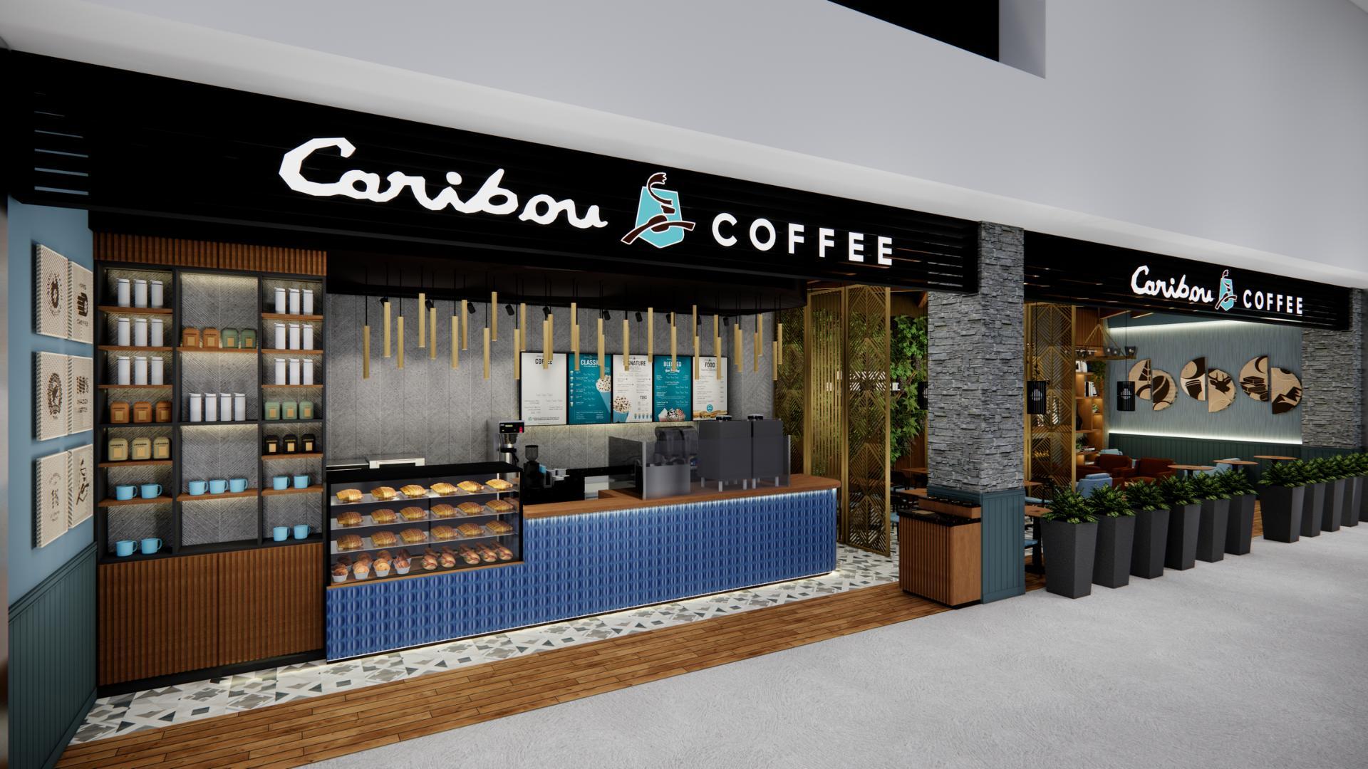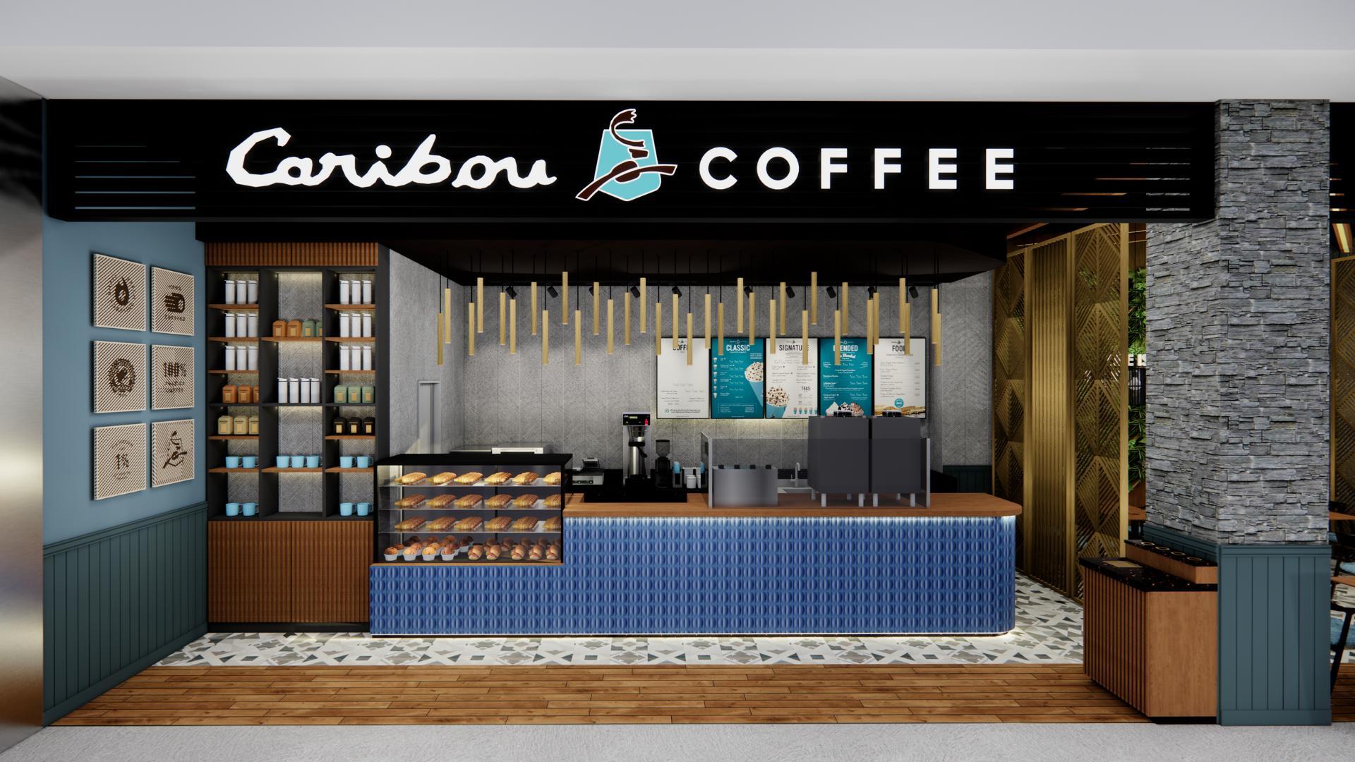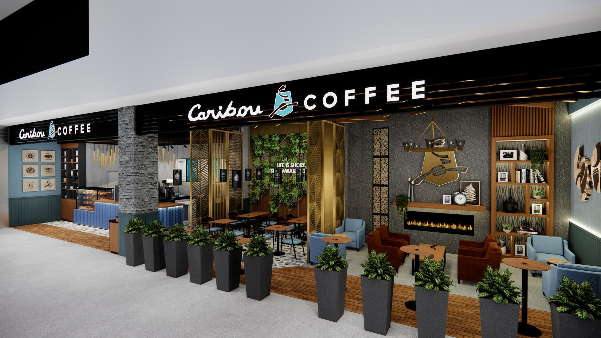 Caribou’s signature branding colours are layered with natural wood finishes, a lush green wall feature, and the iconic Caribou fireplace, reimagined in a modern black stone statement. The result is a contemporary yet cozy interior that remains true to the brand while giving guests a place to pause, recharge, and enjoy their coffee in comfort.