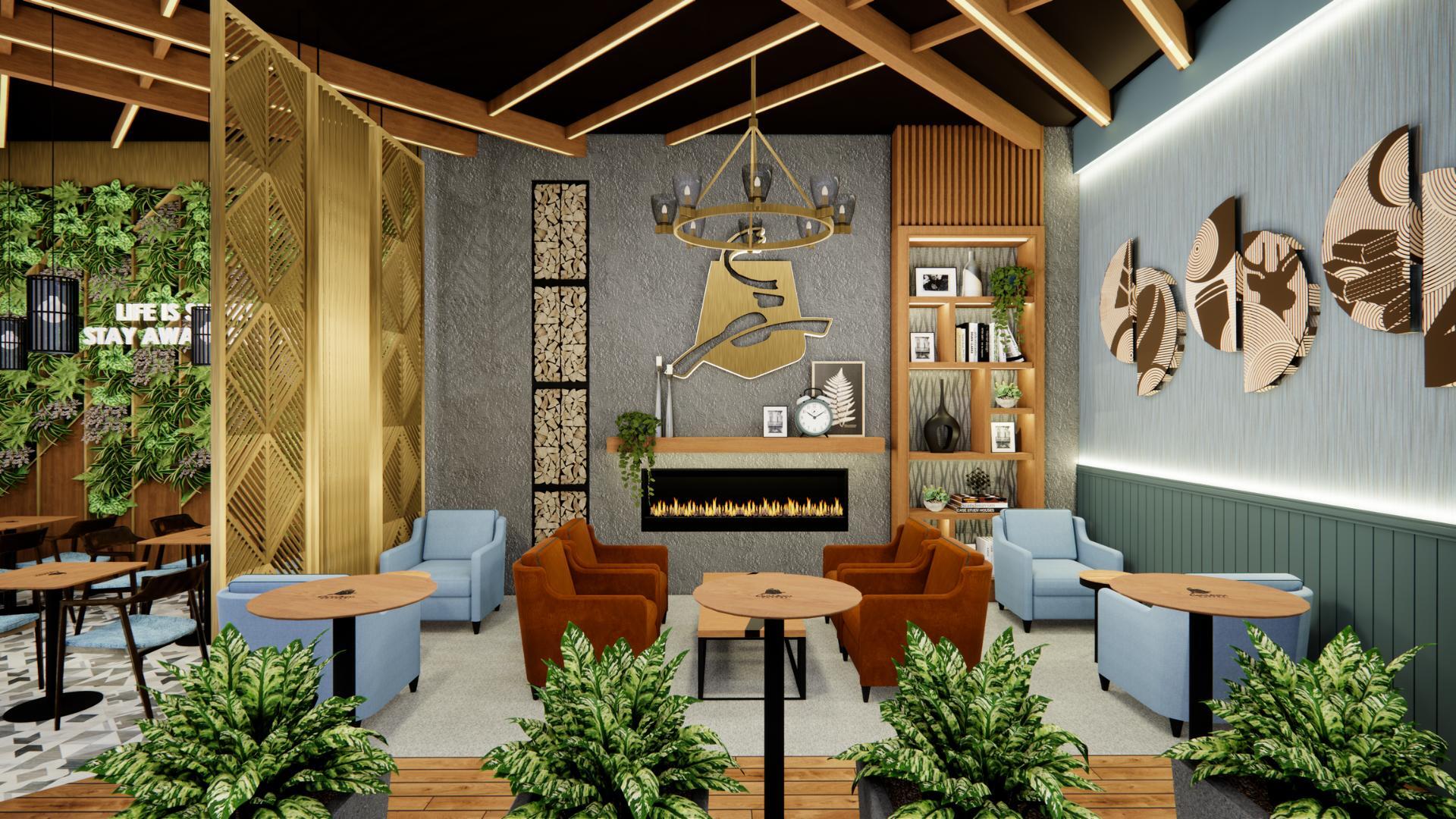 Evoke Interiors conceptualised and delivered the Caribou Coffee at Exhibition World Bahrain as a warm, inviting retreat within one of the region’s most active exhibition destinations. Amid the energy of local and international events, the space was designed to offer exhibition-goers a calm, comfortable environment that feels personal rather than commercial.